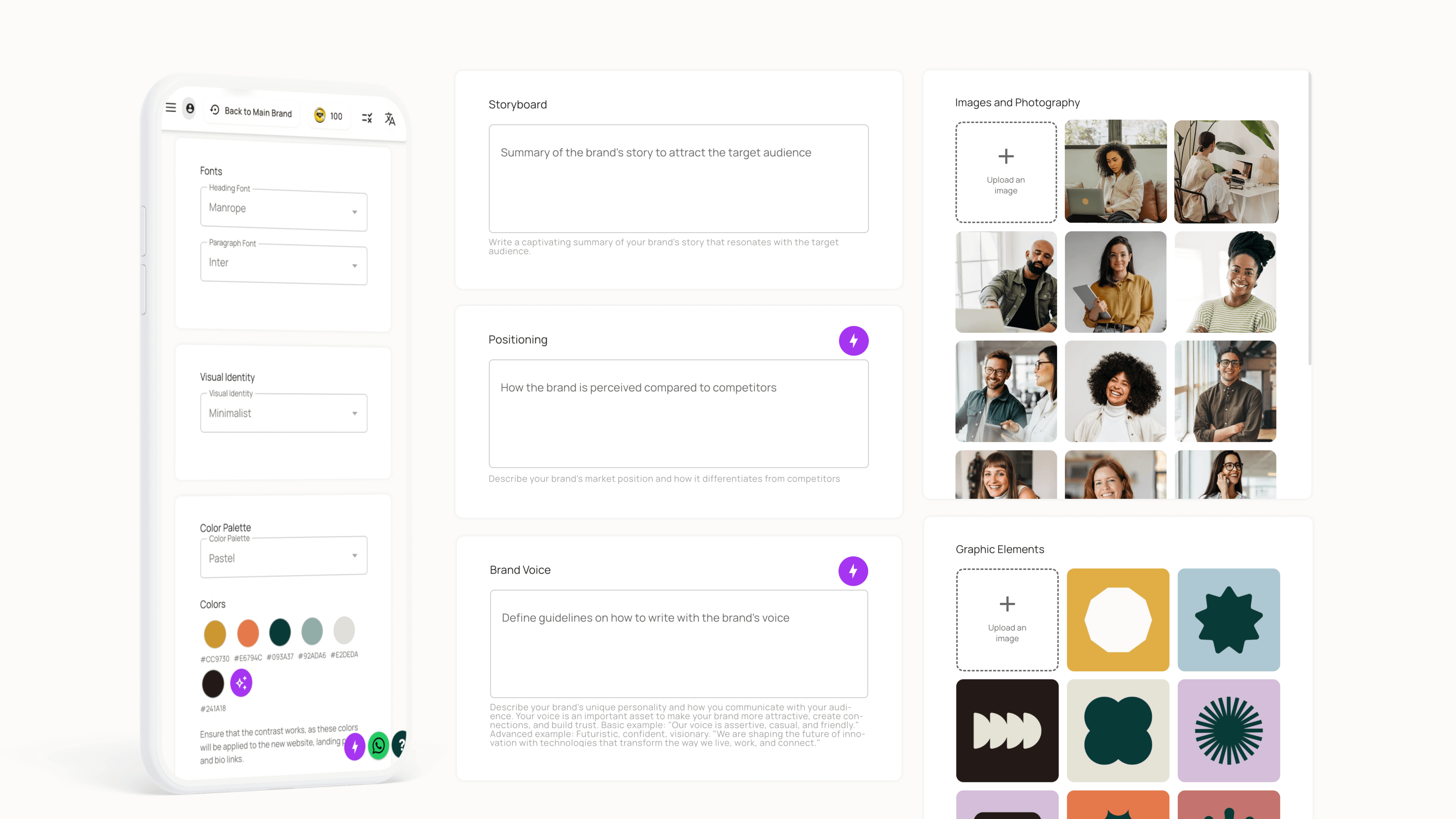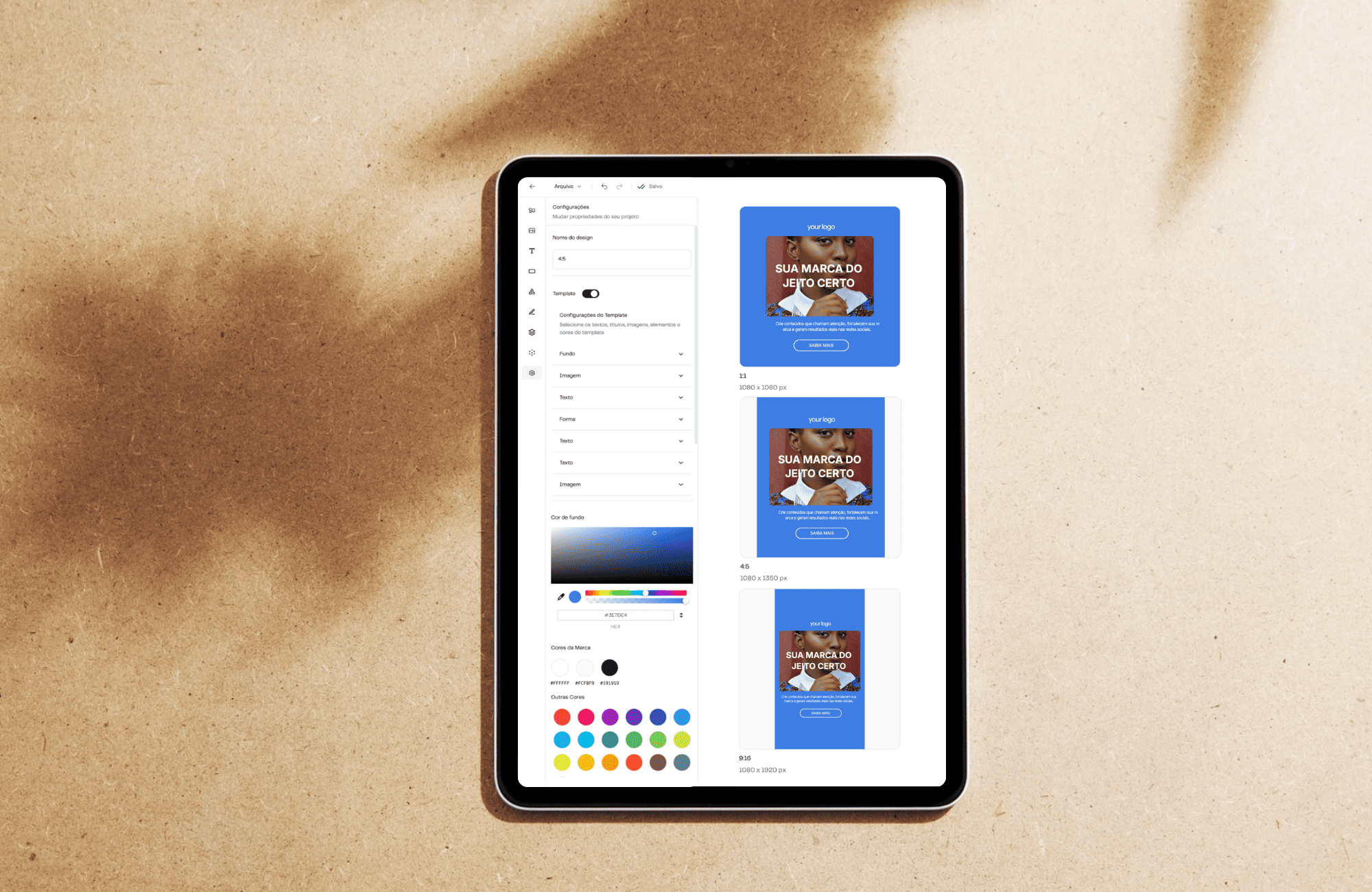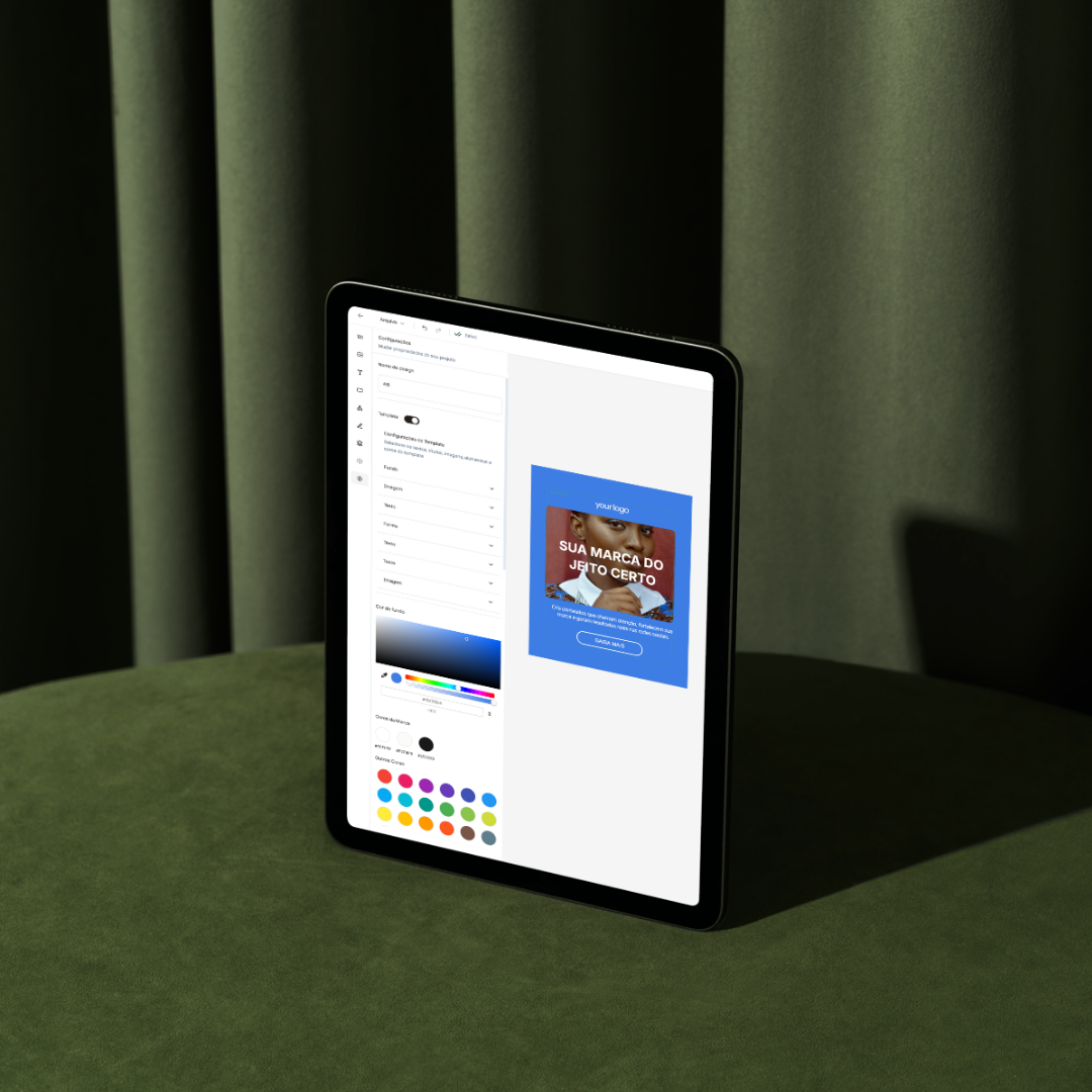 Centralize cores, fontes, tom de voz e recursos da sua marca em um só lugar. Assim, cada página, anúncio e e-mail já sai alinhado à sua identidade, sem esforço.
